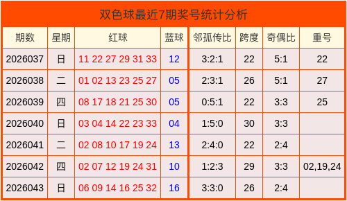 重号分析:在最近7期的奖号分析中,有4期开出过重号,本期分析不开出重号。